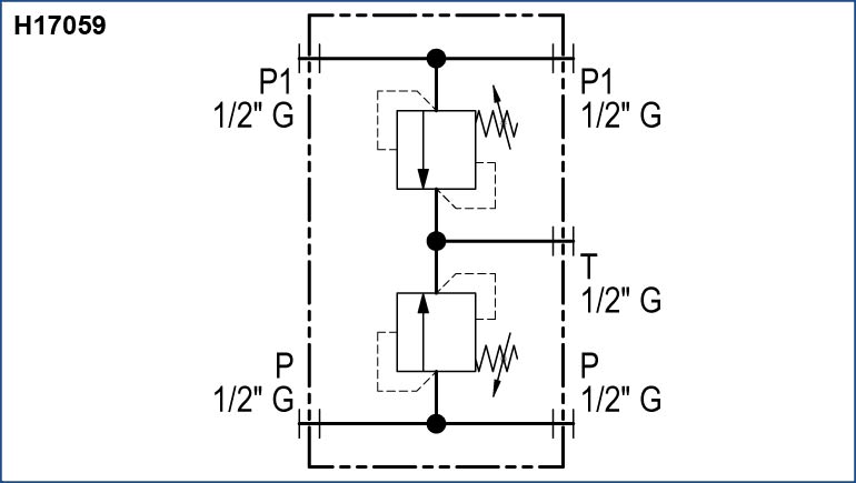 Two crossing pressure lines P and P1, and one tank line. All ports 1/2" G.