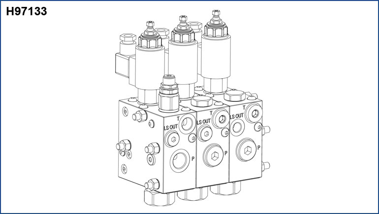 This equipment allows to set diferent low rates and diferent pressures for multiple outputs connected to the same variable displacement pump. On each section the electrically operated cartridge is the same in on-of and proportional. It is equipped with a manual stroke limitation to use with the on-of coil. The same function is done electrically by adopting a proportional coil. The low rates and pressures set are also respected for contemporary uses. To ofer greater lexibility in warehouse management, the diferent types of sections, input / intermediate / closing, use the same manifold. So they can be transformed into another type of section by adding / removing a few components (see bill of materials for details). The LS OUT (towards the pump) must be on the closing section, a potential LS IN (coming from a distributor, for example) on the inlet section. The inlet section can be used stand alone.