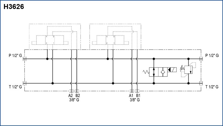 Abbiamo aggiunto a catalogo una nuova base Cetop 3 da 2 a 7 postazioni con valvola di messa a scarico e valvola di massima pressione / P-T passanti 1/2” G / A-B laterali 3/8” G.